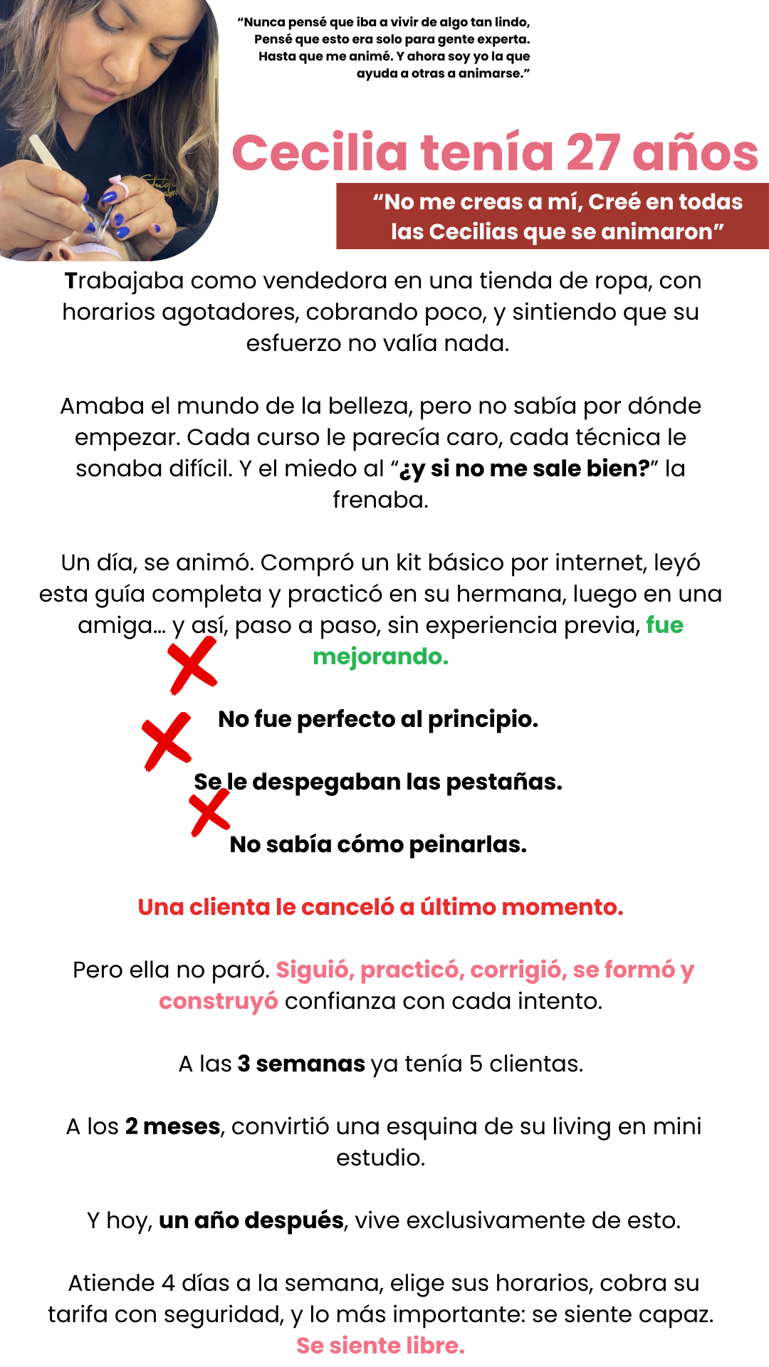 Basado en un modelo de aprendizaje progresivo, este método te guía paso a paso para que cualquier persona (incluso sin experiencia previa) pueda aprender, dominar y empezar a ofrecer servicios de lifting de pestañas en solo 7 días